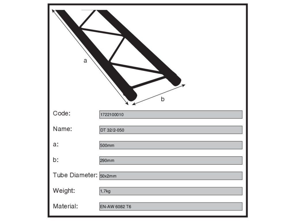 Série DT32/2 je 2bodový truss systém vybavený kuželovou spojkou (spigot), spojovacím kolíkem (trusspin) a pojistnou sponou. Tento rychlospojovací systém se pevně uzavírá s nosnou trubkou a umožňuje rychlou montáž při častém sestavování a rozebírání konstrukce. Hlavní trubky jsou vyrobeny z hliníkové trubky o průměru 50 mm a tloušťce stěny 2 mm, což zajišťuje vynikající poměr pevnosti a hmotnosti. Výztuhy mají průměr 20 mm a také tloušťku stěny 2 mm. Každý truss díl obsahuje všechny potřebné kuželové spojky, ocelové kolíky a pojistné spony.