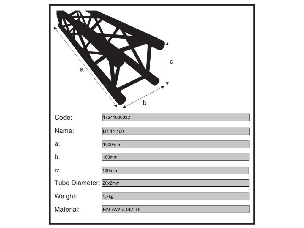 DT 14/2-100 je součástí systému DT14 od DuraTruss – lehkého a dekorativního příhradového systému vhodného pro obchody, výstavní expozice i domácí dekorace.