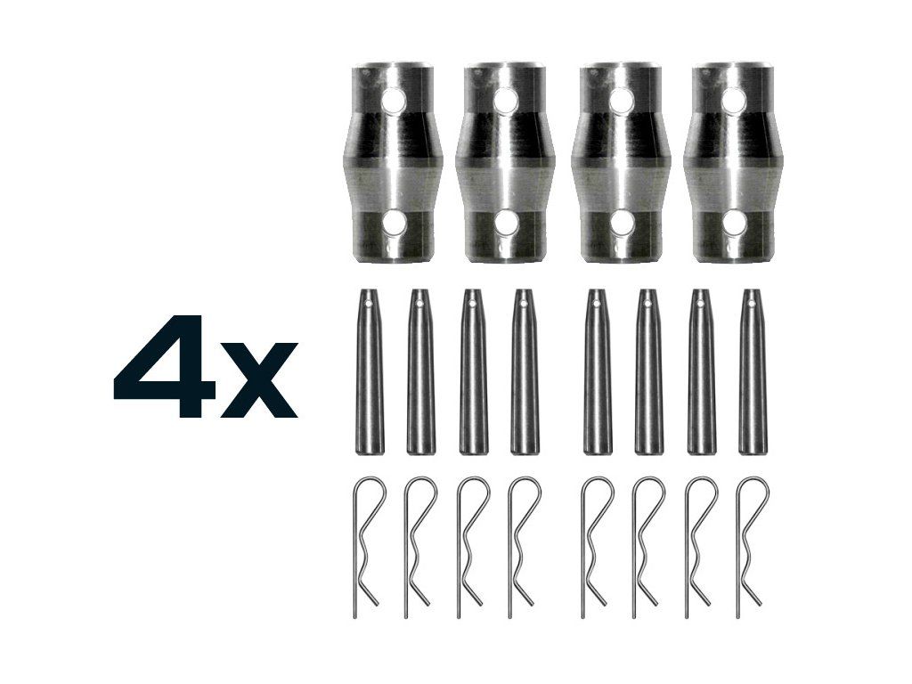 Balení obsahuje: 16× kuželová spojka, 32× ocelový čep, 32× pojistná spona