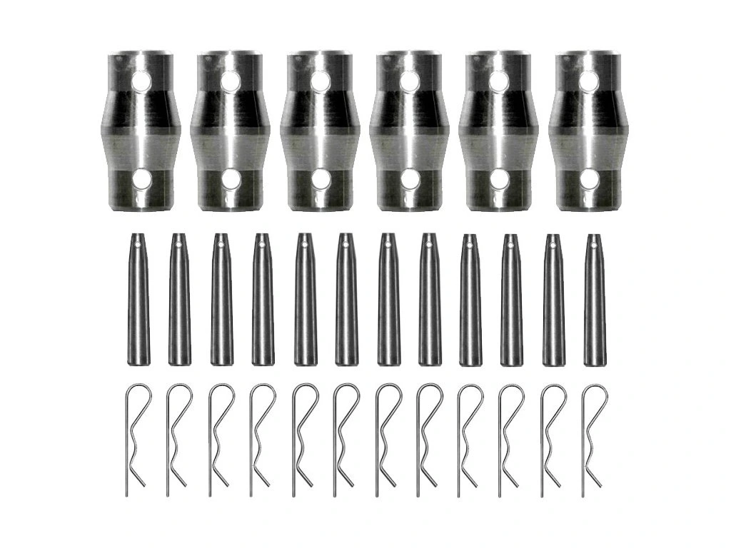 Součást dodávky: 6 kuželových spojek, 12 ocelových čepů, 12 pojistných spon