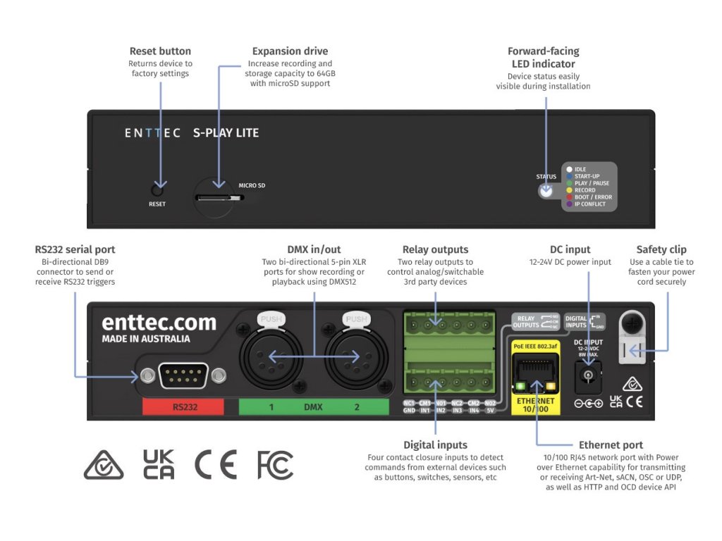 - Nahrát je možné až 16 DMX výstupů za pomocí sACN, Art-Net nebo dvou fyzických obousměrných výstupů