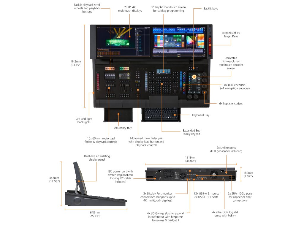 - I/O Garage se čtyřmi pozicemi, které přijímají brány pro řízení show typu Response backpackstyle nebo výstupní moduly Gadget II DMX