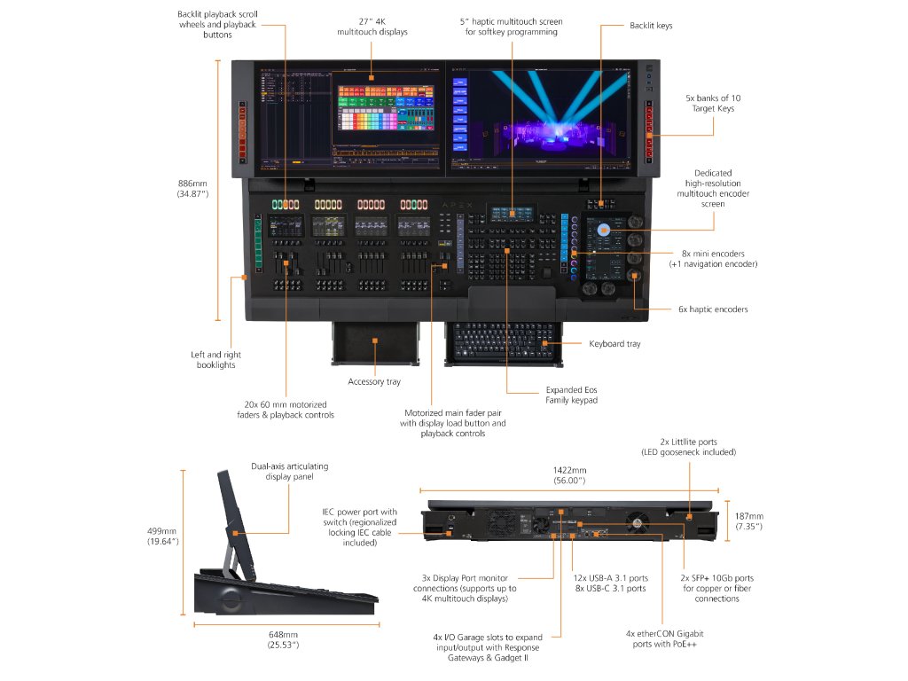 - I/O Garage se čtyřmi pozicemi, které přijímají brány pro řízení show typu Response backpackstyle nebo výstupní moduly Gadget II DMX