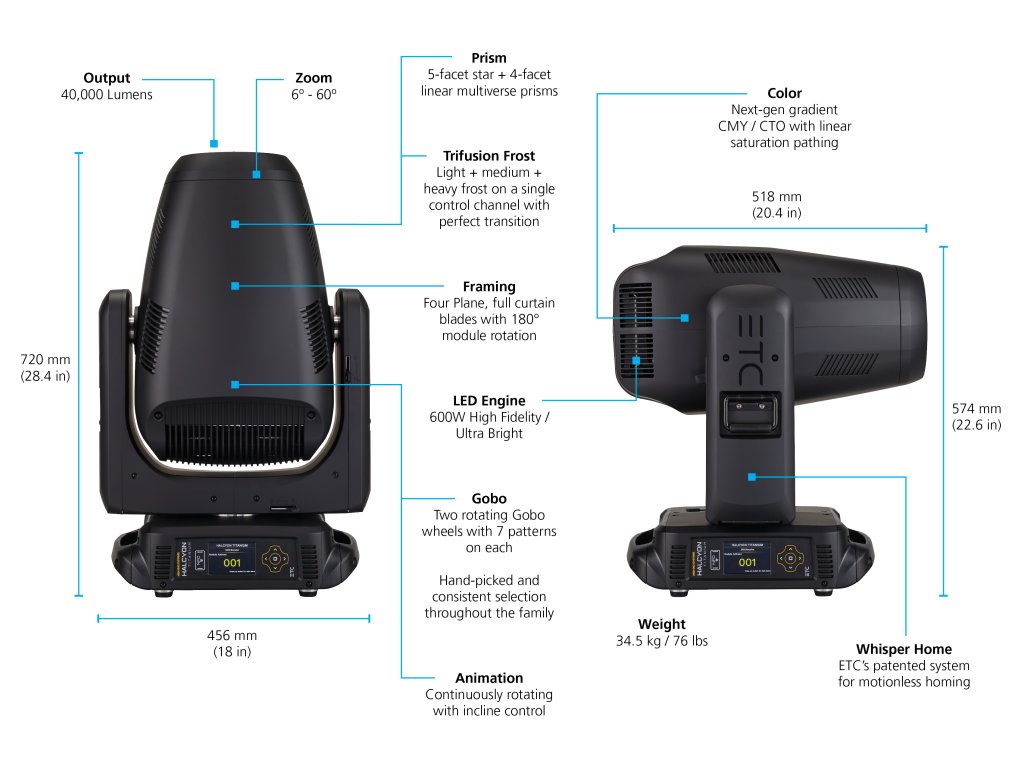 High End Systems Halcyon Titanium, prostřední produkt z řady svítidel Halcyon Framing, je světlo s výkonem přes 40 000 lumenů. Svítidlo Halcyon Titanium, které překonává svítidla z minulosti o 15 000 lumenů, má také extrémní sadu funkcí se vším, co uživatel potřebuje k osvětlení show všech tvarů a velikostí.
