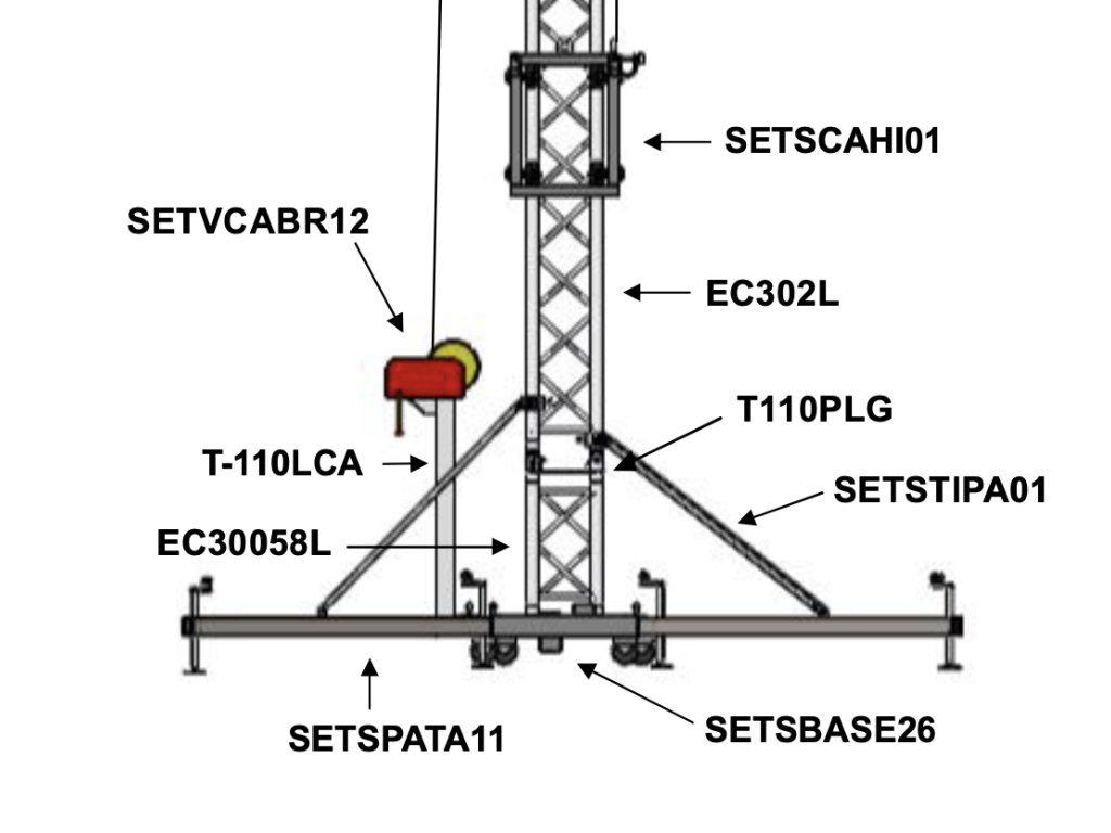 - Stabilizační nohy, při jejichy rozložení je půdorys toweru 2,84 x 2,84 m.