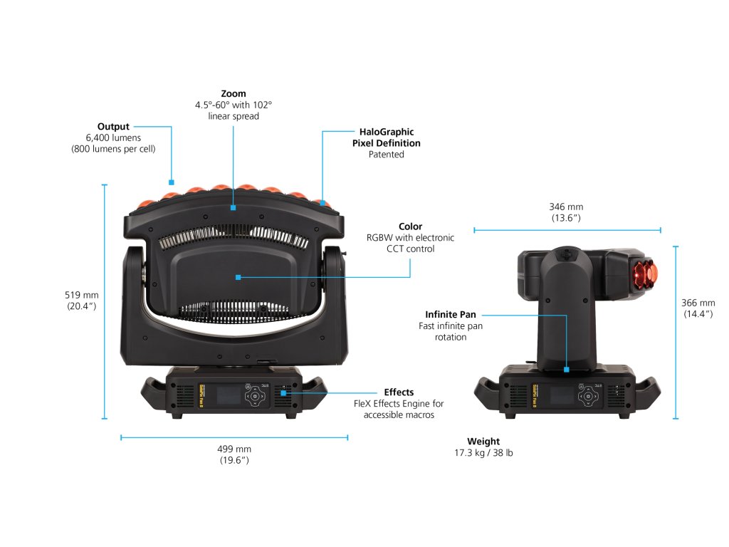 - Vějířovité uspořádání diod LED poskytuje úžasný vzhled vzdušného vějíře a zároveň zlepšuje možnosti washového pokrytí pódia