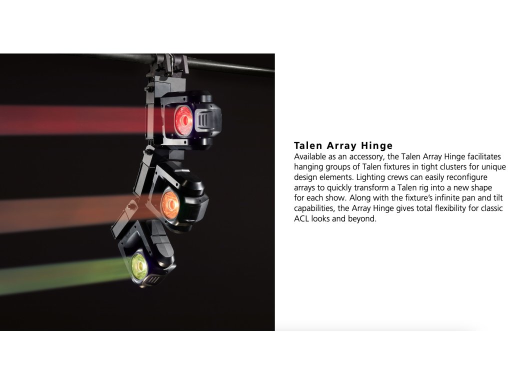 Talen má intenzivní paprsky, které jsou vytvořeny pomocí RGBW čipů. Svítidlo má extrémně úzký 3° paprsek s vysokým středovým jasem. Talen má nekonečný pohyb PAN a TILT. Svítidlo disponuje dostatečně malými rozměry, a tak se vejde opravdu kamkoli. Lze jej také nastavit do mnoha kreativních závěsných poloh pomocí závěsu Talen Array. Svítidla lze snadno konfigurovat a řešit prostřednictvím aplikace ETC Set Light.