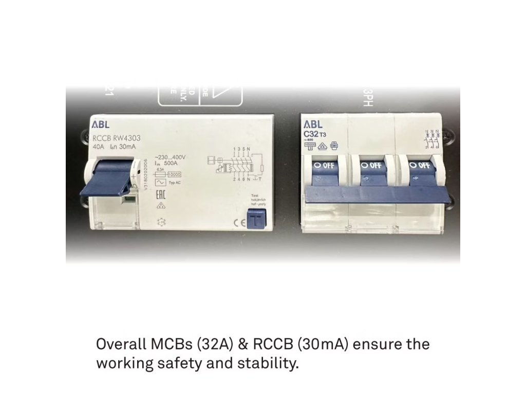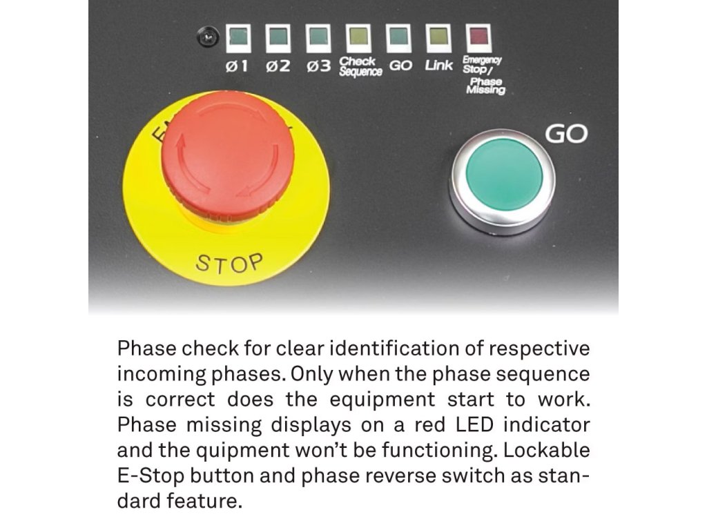 - Součástí je "total stop" tlačítko, 3f jištění a proudový chránič pro funkčnost dle platných norem