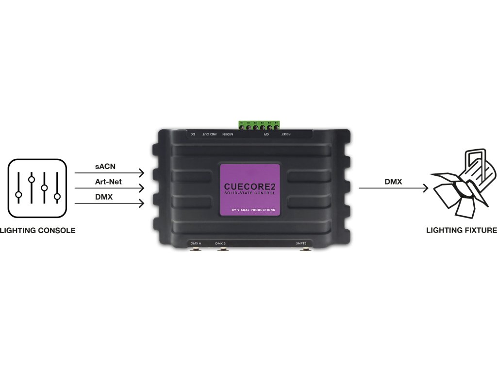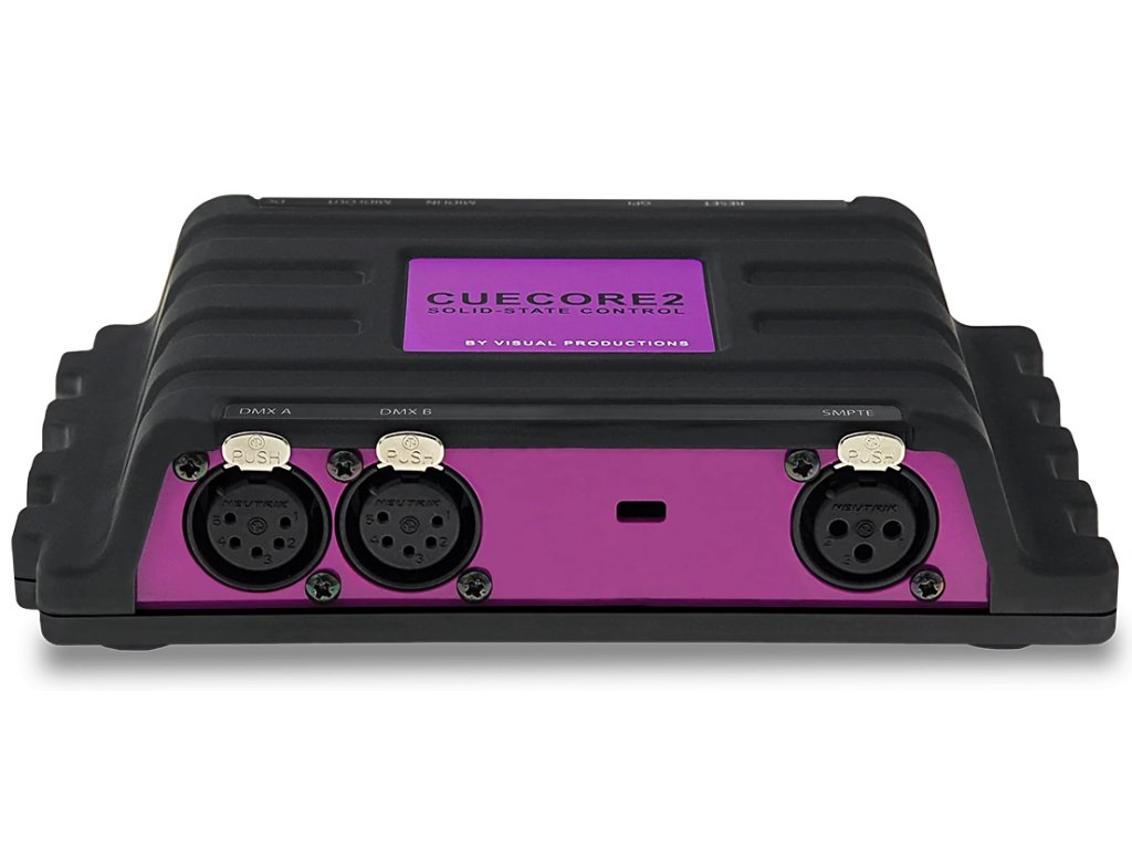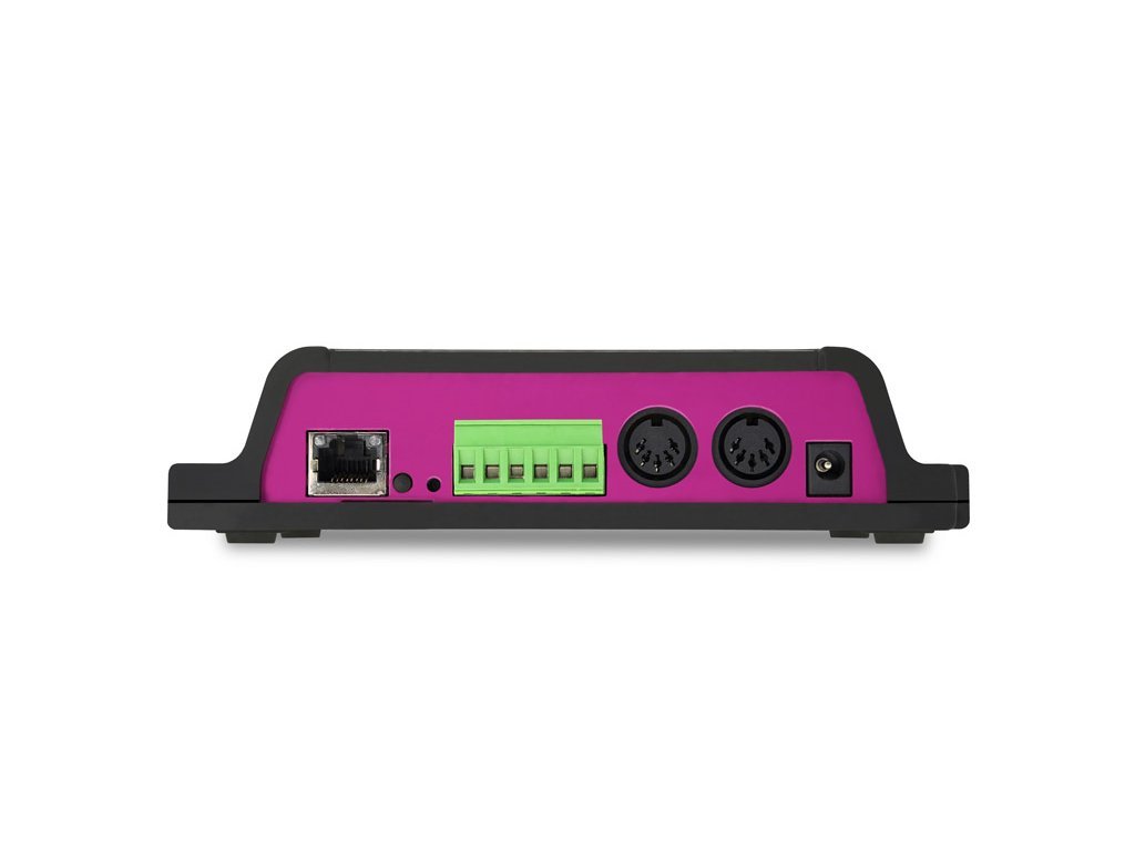 - Je vybaven 2x obousměrnými DMX porty, 1x SMPTE, MIDI IN + OUT, GPI a napájení