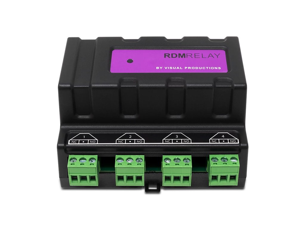 - DIN-lištový relay pack ovládaný pomocí DMX/RDM